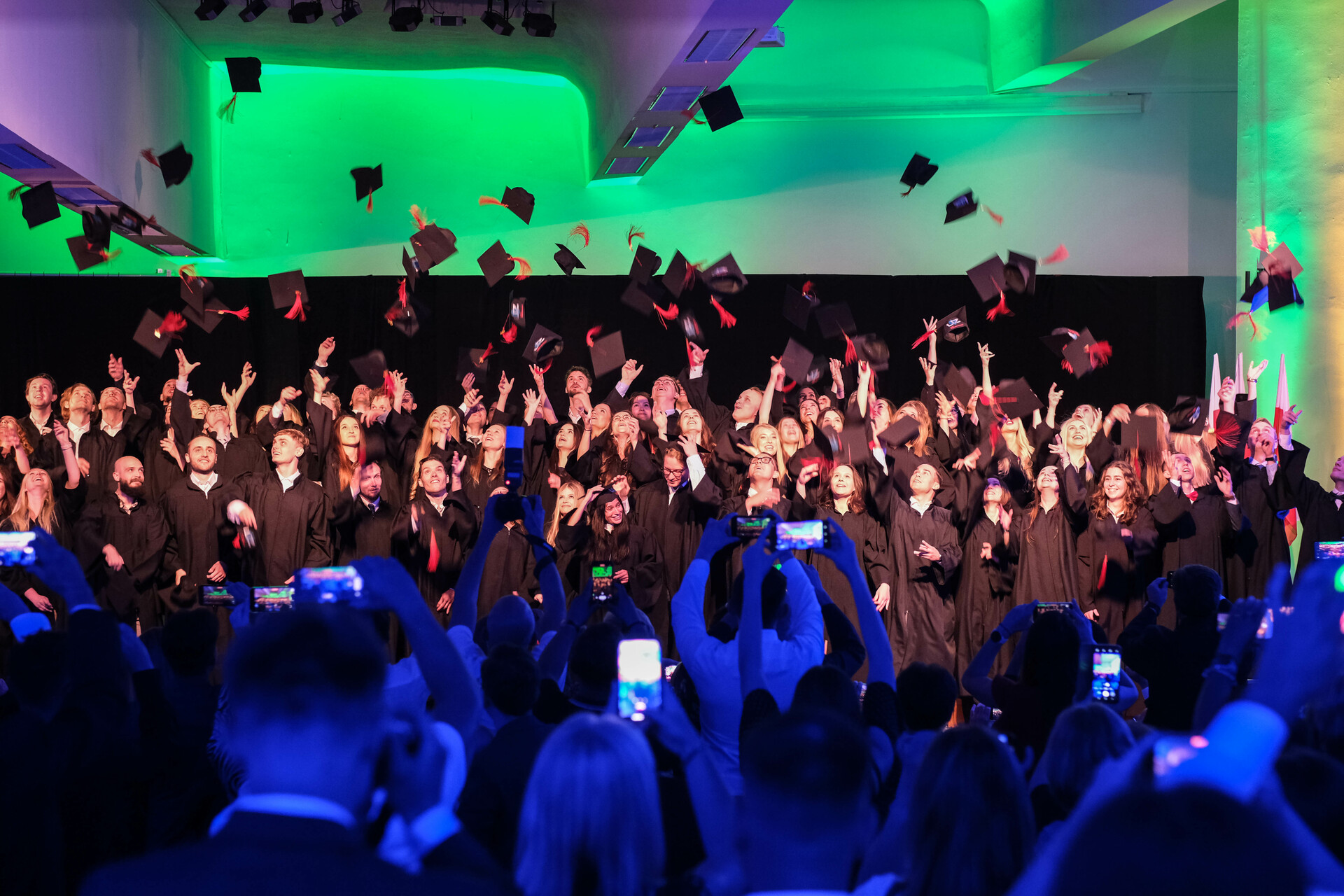 Absolwenci kierunku lekarskiego 2023 wykonują tradycyjny rzut biretem; fot. M. Adamczewski